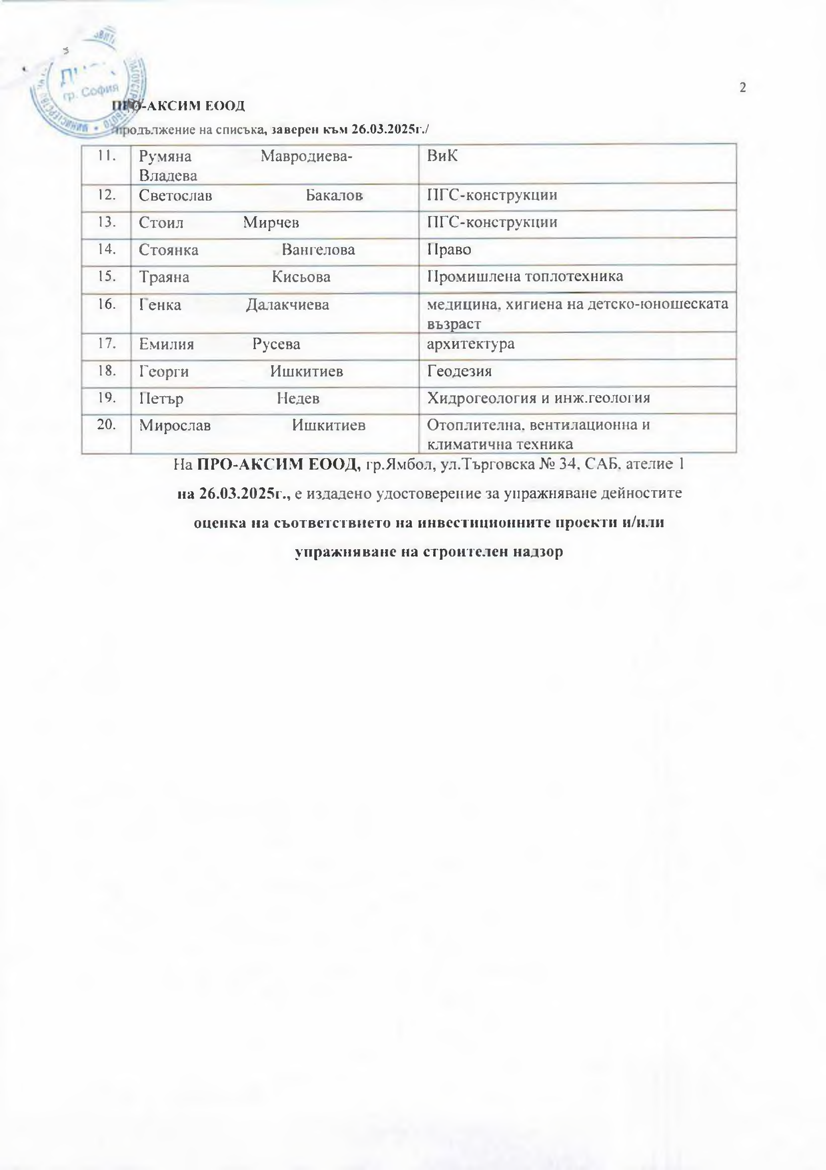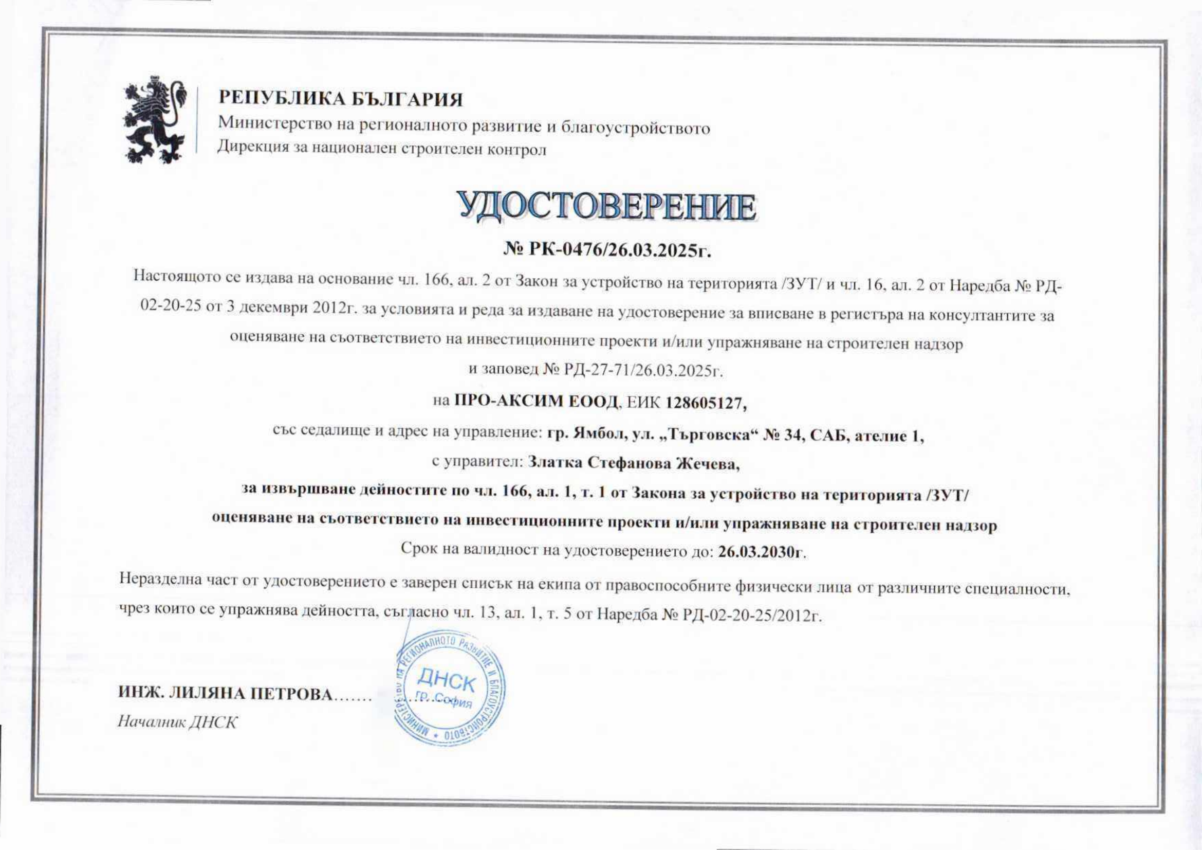Дългогодишен опит в строителния надзор и изготвянето на технически паспорти. Про-АКСИМ ЕООД е вписана в регистъра на ДНСК като фирма за строителен надзор съгласно чл.166, ал.1, т.1 от ЗУТ.