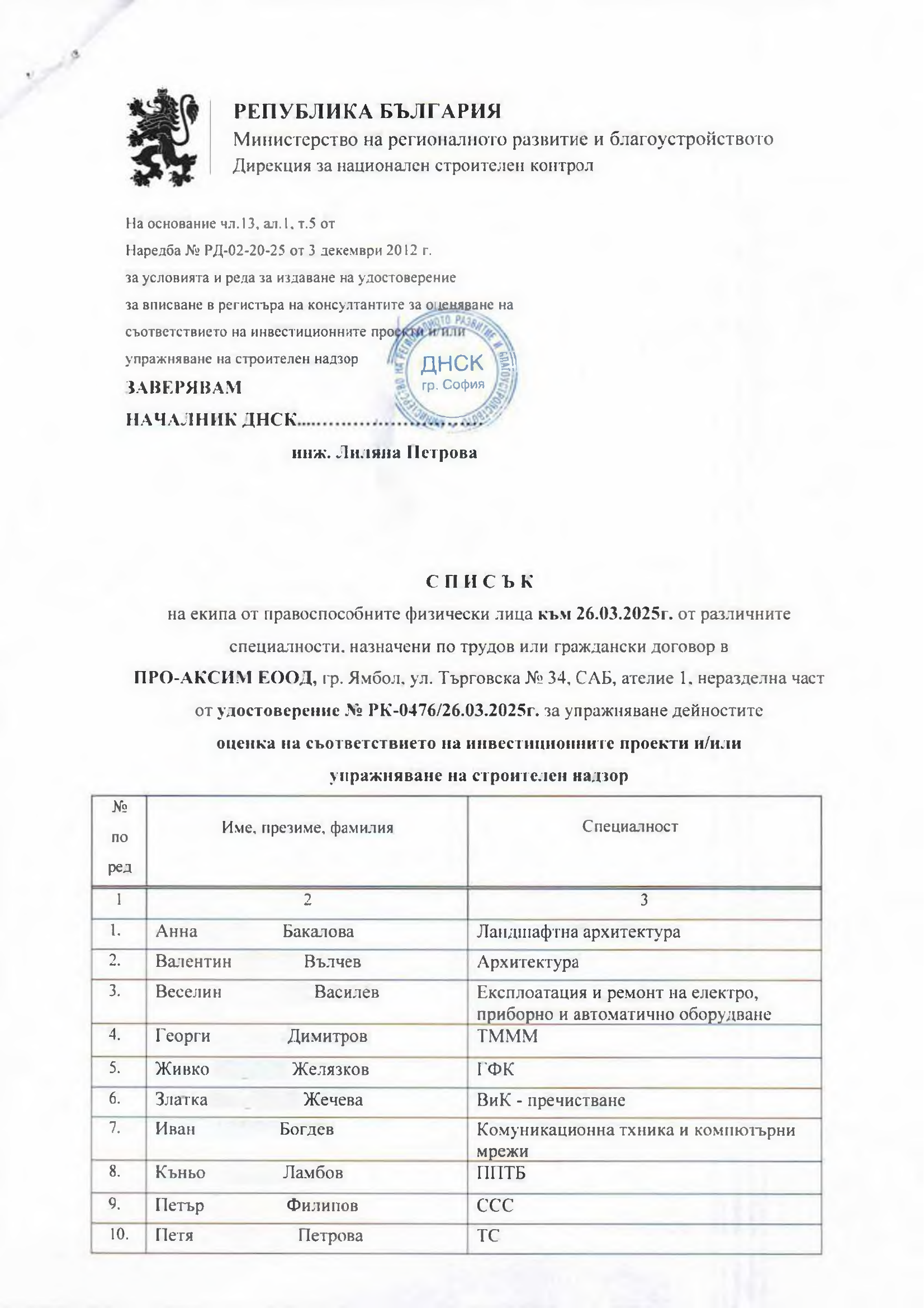 Удостоверение за консултант по чл.166, ал.1, т.1 от ЗУТ — Регистър ДНСК